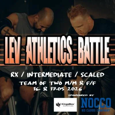 Das LEV ATHLETICS BATTLE findet am 16. & 17. Mai 2026 als Team-of-Two Competition (RX: Male/Male oder Female/Female// Intermediate & Scaled: Female/Male) statt.
